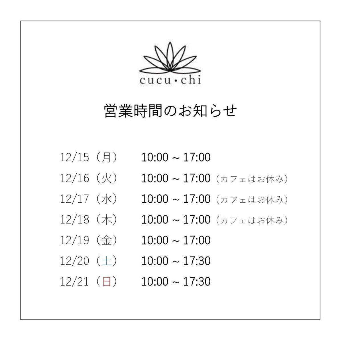 ホーム / お知らせ / 営業時間のお知らせ(12/15〜12/21)